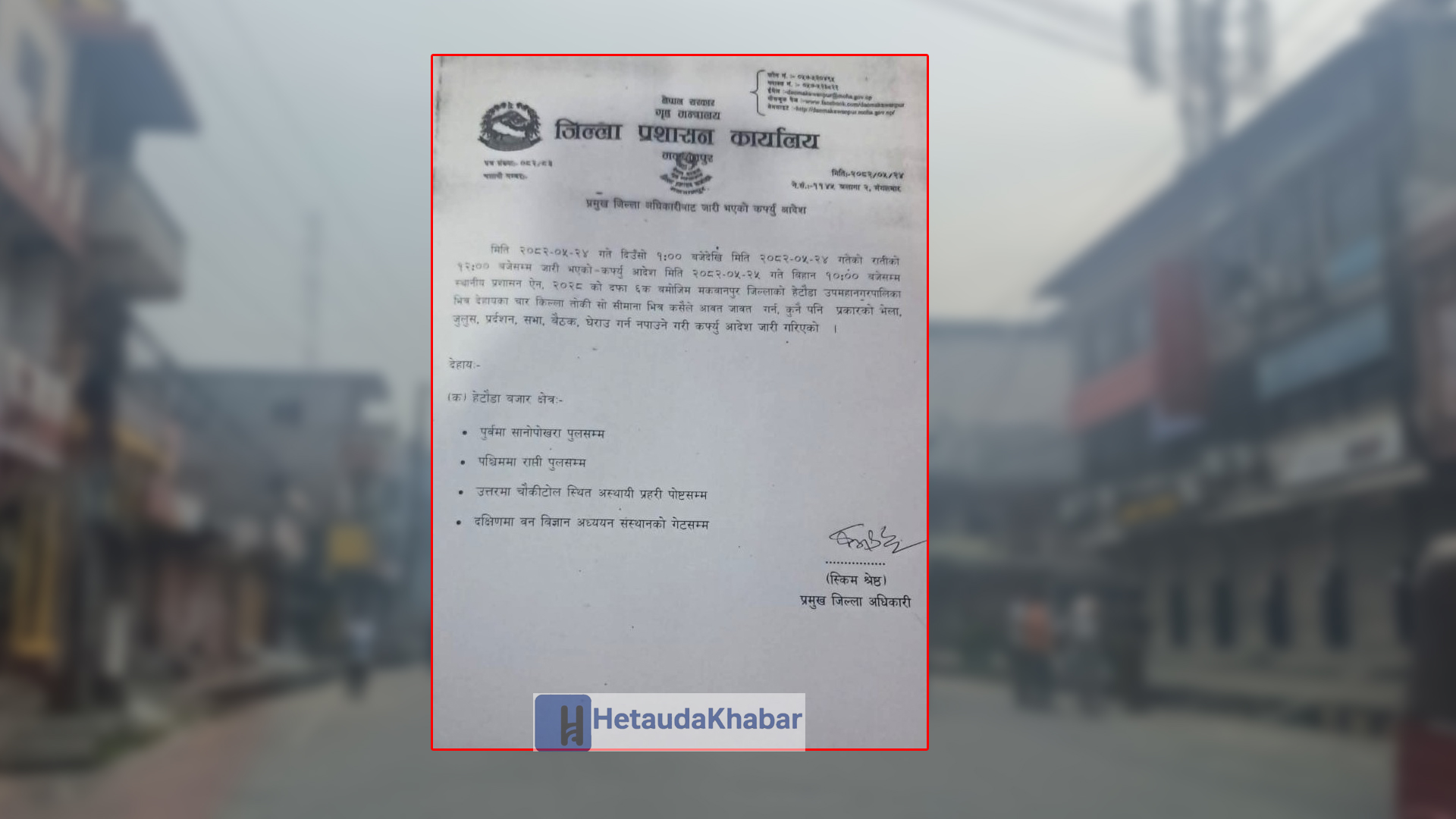 आज राती १२ बजे सम्म लगाइएको हेटौंडाको कर्फ्यु भोली बिहान १० बजेसम्मको लागि थपिएको छ ।