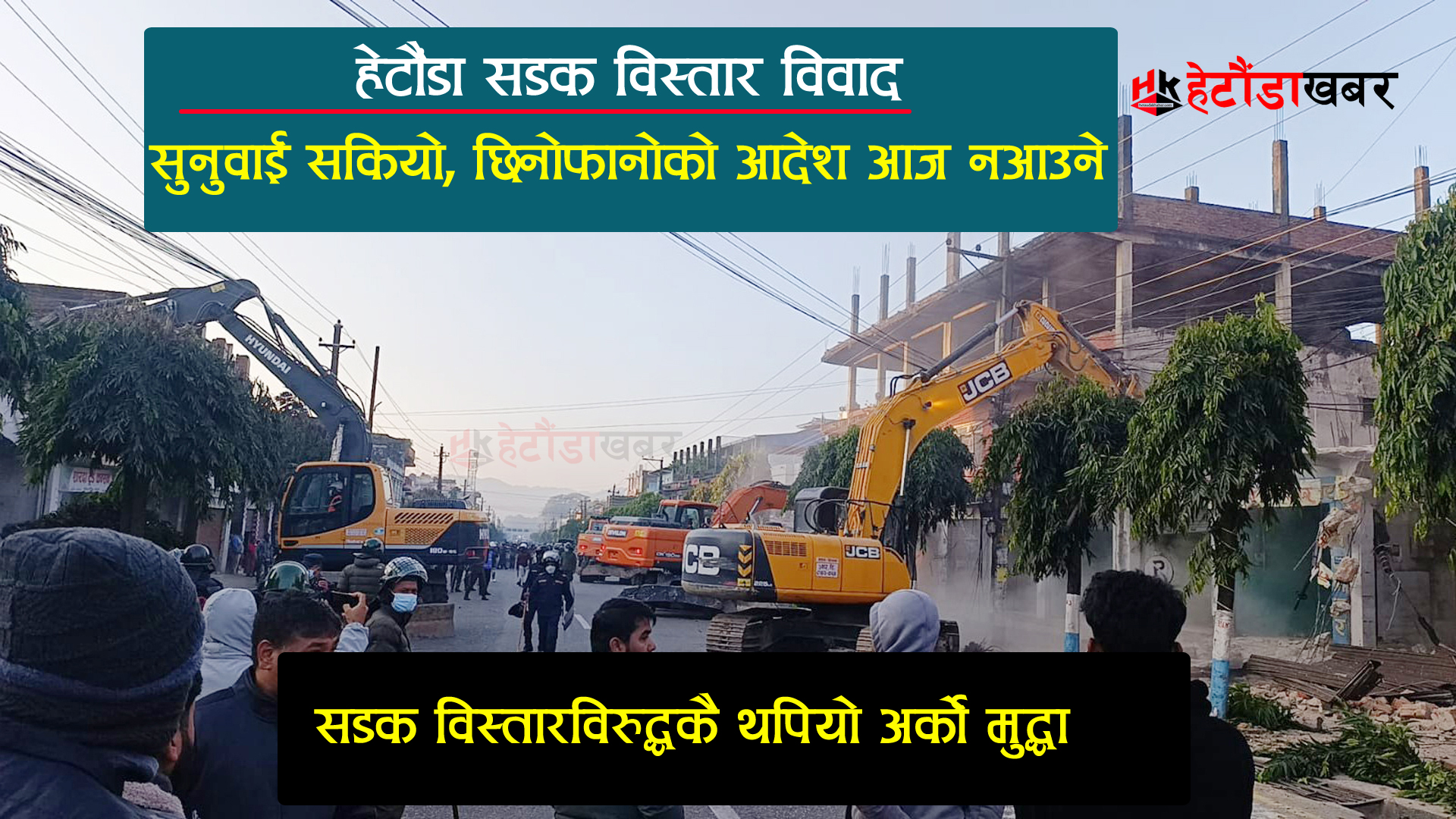 हेटौंडा सडक विस्तारसम्बन्धी विवादमा दायर रिट निवेदन उपर सुनुवाई सकिएको छ । पटक पटक हेर्न नभ्याइने र नमिल्ने भन्दै स्थगित पेशी आज सातौ पटक न्यायाधीश विनोद शर्मा र शान्तिसिंह थापाको संयुक्त इजलासमा परेको थियो ।